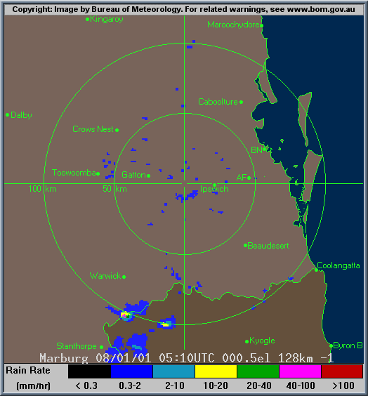 SEVERE THUNDERSTORMS - JANUARY 8, 2001 A combination between an upper level and surface trough caused widespread showers and thunderstorms to develop in NE NSW and SE QLD on this day. In NE NSW, a storm dumped copious amounts of hail 25km's NE of Tenterfield, with reports of a "snow like" covering. Storm chasers Anthony Cornelius and Adam Cole photographed a wall cloud and funnel near Tenterfield. This funnel could quite possible have been a retracting Tornado. Jason Rainforest and myself were at the same location, and took the following photos. In SE QLD, a very large and strong storm developed around the Warwick area late in the afternoon, dumping large amounts of hail and rain which damaged crops as it moved north. Jason Rainforest took the following photos. Also the following hail drifts, tree and crop damage between Warwick and Cunninghams Gap, and a cell approaching Beaudesert during the evening (last photo). This storm dissipated a short time later, howeve another developed to it's NW and moved generally north, hitting the eastern suburbs of Toowoomba, and the town of Murphy Creek just to the east. 14 houses were damaged in Toowoomba, and the Murphy Creek area suffered considerable tree and property damage. Jason Rainforest and myself surveyed the Murphy Creek damage the next day, and took the following photos. The damage path was between 3 and 4 km's wide,