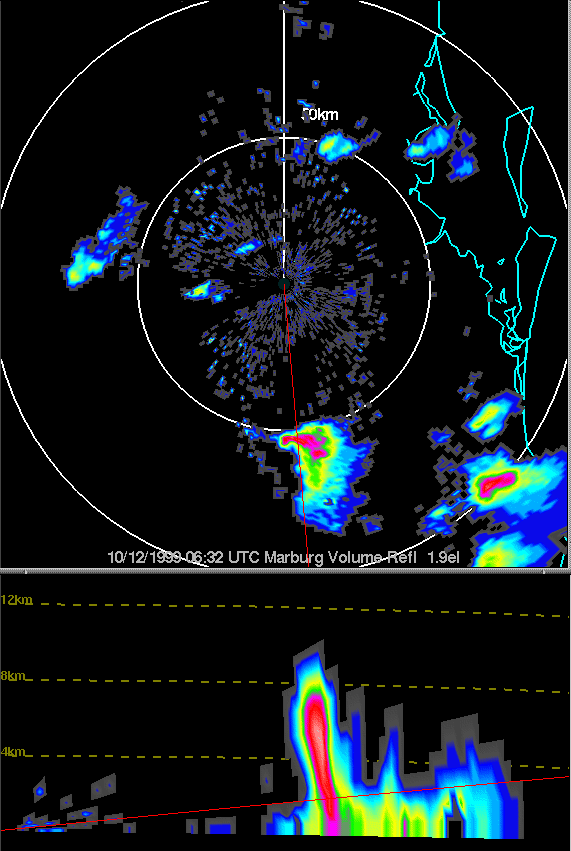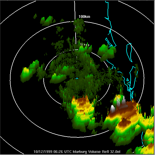 The maximum height of the storm appears to be around the 18-19km mark, however there are sections of radar where the echos appear to go out of radars range (ie, orange echos above the white echos on the 3D images). The maximum scanning height of the radar is 20km, if this is true - then the actual highest tops could have infact reached in excess of 20km!!! You can also a small line of thunderstorms that moved through the northern, and eastern suburbs of Brisbane, these cells actually moved WNW to ESE, and still attained a height of approximately 12km, indicating that they were by no means weak. Almost any of the smaller/weaker cells that day moved in an ESE/SE, these were all multicells, indicating any left movers were most probably supercells. Radar