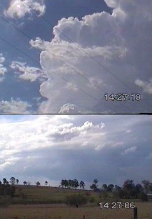 I got some distance north of this cell before finally stopping, changing my underwear and looking back at the storm. To my dismay, the updraft region was looking sick, and it looked like cell had lost a fair bit of grunt. However new cells were forming to my NW, over the Brisbane Valley-Crows Nest region! The updrafts on these cells were very strong, and they were producing thick anvils.