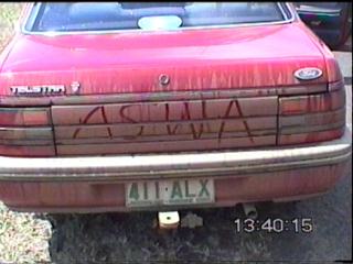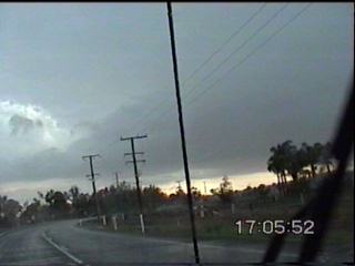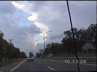 Static on the am was increasing rapidly, and with weak cells starting to clutter up the Cunningham Ranges region, I decided to head north, even though the cells would normally move into unchasable territory. But not before looking at the back of my car, and engraving the name of an association that I�m proudly a member of though! (Australian Severe Weather Association http://www.severeweather.asn.au ) One cell in particular caught my attention, it seemed to be moving towards me! I wasn�t sure if this was right, as most cells move NE, not SE! However a phone call from a good friend of mine giving a radar update confirmed that one of the cells had actually split, and this was the right mover! It looks impressive for a right mover, in my experience most right movers don�t last very long, but this had a well organised flanking line, and from a distance (50km) looked like a very strong thunderstorm. I shot NNW in the hope to try and get close enough to this cell, as I got a better view, I was starting to notice a lowering under the main updraft of the cell! However I couldn�t tell as I had small area of hills near Marburg in the way! However I finally was able to get a glimpse, and what lay underneath was a lovely circular war cloud!