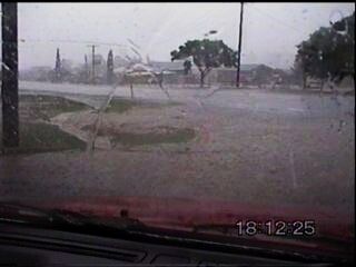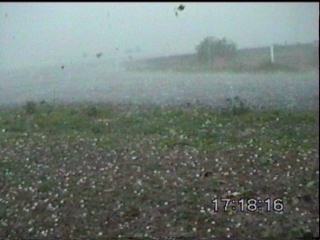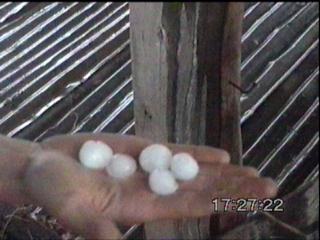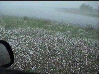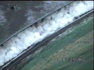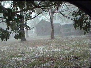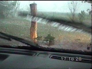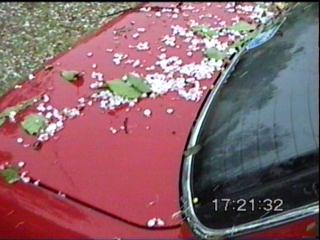 The updrafts of the actual cell looked circular too, this was certainly a very nice supercell I thought! I continued eastwards towards Ipswich and the Brisbane western suburbs, the mammatus was quite impressive (the best stuff not on film though, as per usual!) However, as I looked for a place to shelter with the storm, it collapsed and died just before it reached civilization! Although one inch hail was reported in the Mt Crosby region. I headed back out to Ipswich and caught a glimpse of a rapidly developing cell just to the west of Ipswich. This cell very quickly had very strong rainshafts, and a weak guster region. I could see a better cell behind it, but once more I got stuck in Ipswich and I tried to get out and head south (after being informed this larger cell was also moving SE), but instead another area of cells overtook me that gave very heavy to torrential rain and two lots of pea to one centimetre size hail! Cars were taking shelter under overpasses from the rain and hail. It was yet more chaser convergence when I was trying to work out what car was following me and stopping whenever I stopped, but soon cottoned onto it being Damien Howes! We pulled over in the 2nd bout of hail, and watched the hail bounce on the side, with a few nice bolts of lightning to watch and hear! We continued south, and between cells we briefly caught up and talked, we saw the cell that I saw earlier, and it was still looking very strong! I wanted to get ahead of it, and hopefully stay ahead of it to Beaudesert, however it wasn�t to be! As we headed south, even more chaser convergence with Ben and Jason catching up with us! This cell though soon caught up with us, and very soon we got into some moderate rain ahead of the gust front. As we were continuing along I heard a very loud thump on the car, I thought �I hope that is a loose stone being kicked up, and not hail� � at the same time another very large thump � oh no! Within seconds, the gust front went through with winds around 80km/h and large hail (to 3.5cm!) pounded the cars. Jason and myself turned around and took shelter near a shed/area of trees from the hail. I parked near some trees, I was worried they could be blown over/struck by lightning, but decided to take the risk! I was expecting one of the windows to crack any minute, with the thumps of the hail being incredibly loud on the car! I was frantically trying to video tape this, and was watching as branches and leaves fell onto my car being shredded by hail and winds!