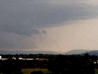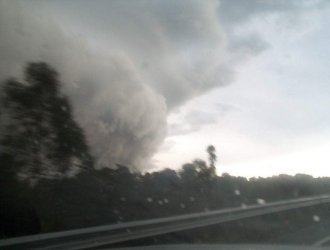Reports of a "great shelf cloud" from Anthony Cornelius mid afternoon, who was chasing SW of Brisbane, raised my hopes of an interesting afternoon as a squall line became more and more organised on radar. As it moved east, the northern end of this line became quite intense on radar, and i decided to head out and intercept it. On my way north, i saw some fairly strong updrafts in the center of the line (which was now around 100km long). I decided to turn back south, and head for a lookout about 15 mins away. As i made my way there, a very long shelf cloud can into view, with precipitation on the southern and northern end, and little or no precipitation between them. I arrived at my lookout, and watched the line for a period of about 15 minutes. The southern end was more interesting features wise, and i kept a close eye on that. I glanced back towards the northern end for a few seconds and noticed a strange tornado like column extending from the leading edge of the line, to the top of Mt Em. At first i thought it was smoke! as i had seen something similar in a chase report only a week or so earlier, but after about 20 seconds i thought it was interesting enough to take a picture (first one below). Over the next few minutes, i watched this column retain pretty much the same shape, but become fainter and fainter until it completely dissipated!!!! It was at this stage i realised i had just witnessed a Tornado! Or to be more specific, a Gustando.