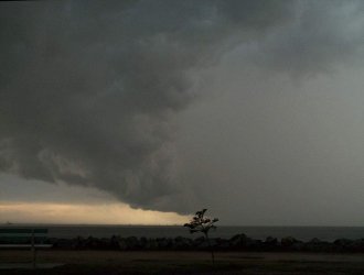 I continued to photograph a cell which had developed north of the southern most precipitation when i first arrived at the lookout. This developed a slightly lower shelf cloud, and quickly became quite photogenic. It was now starting to get very interesting! I decided to move to another lookout in order to stay ahead of it, and keep taking pictures. This turned out to be a good move - only 10 minutes down the road, i turned around to see a spectacular shelf cloud! with the southern end of the line building out, and some spectacular and sections of the shelf cloud looking very grunty. I took the pan below (thanks to Daniel Weatherhead from SSC for digitally joining the pictures!!) I quickly jumped in the car and headed for the highway, hoping that i could go north and stay ahead of the line. Along the way the northern end of this line also took on a 'bulging out' appearance. I finally got to another lookout, after lightning my way through some very annoying traffic. The sight that greeted me was nothing short of SPECTACULAR - the shelf cloud to the south was now bulging out in a spectacular fashion!!! with smooth laminar appearance to it, and generally extremely photogenic!!!! I took lots of pictures. I tried to continue north and stay out of the rain, but heavy traffic slowed me down, and by the time i got to a lookout i was under the shelf cloud, and rain started falling. Winds up to 35 knots or so were experienced,