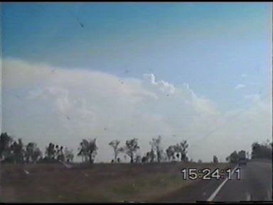 Paul Yole was staying with me for a few days for the QLD ASWA Christmas BBQ, we saw thunderstorms developing to the south of Warwick, and even though I had just come back from 3.5weeks/14,500km of chasing, the temptation to head out again was too great! Not having a large amount of time, we took the M4 to get onto the M2, and then onto the Cunningham Hwy towards Warwick. It was extremely hazy, it had been hot and humid for the past couple of days, and today was even worse (or better, depending on how you look at it!) Static was quite frequent, but it was difficult to see things still. But we could see some very strong updrafts to the SW, and some nice anvils through the smoke and moisture haze.