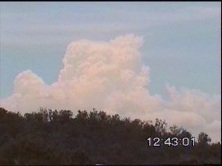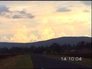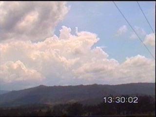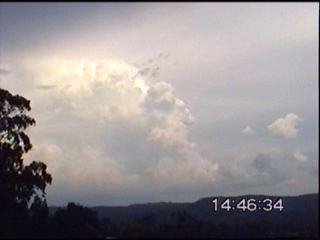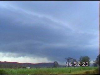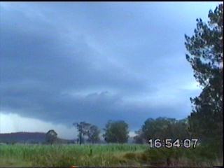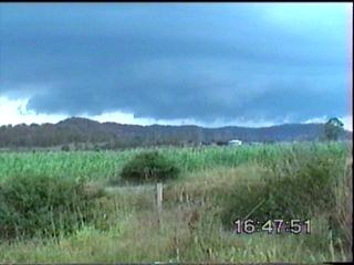 I noticed a few CJ's take the extra step to the SW and decided to head towards Rosevale. I parked just outside of Rosevale and listened to rumbles of thunder, but was somewhat frustrated as all the storms were on the ranges and they were moving at approximately 0.1km/h. I headed further south, hugging the ranges on the last road that exists before the steep ascent! I got to the back of Aratula and saw some interesting moist lowerings and CG's, but nothing of huge significance. I parked just off the side of the road in an abandoned driveway pointing the video camera towards the storm hoping it'd produce a nice CG - not to happen though, Murphy well and truly having an effect! But it was somewhat humorous watching (speeding) cars drive by and slam on their breaks thinking I was a cop car. I was tempted to head further east to some developing updrafts that were very large! However, there were some other storms that had developed to my west, and with the suggestion of Dr Pearce I decided to head NE around the ranges to try and intercept these cells near Gatton. I took the usual back & dirt-road short-cut to get towards Grandchester, and eventually Gatton. The main cell I was trying to intercept was moving faster than everything else, but it still was not moving very quickly so I had a bit of time up my sleeve. Just outside of Forest Hill (town before Gatton), I stopped and videoed some nice base features on the NE side. The storm was currently going through Gatton � I�d have to go through the storm first before I could get north of it. I got some torrential rain, and some nice CG�s within several kilometres, but hardly any winds! I eventually got north of it and headed towards Crows Nest, I knew I was going to run into the thick forests soon, but I was hoping I�d be able to find a clearing somewhere. I was in luck! About 15-20km north of Gatton I found a side road that looked promising as it headed towards the valley. Another storm had developed to the west of my original target one, and it was going to pass very close to the valley. Not having many options, I decided to head for the valley and watch as a fairly nice guster moved over. It was extremely humid, with DP�s in the mid to high 20�s! I had the unfortunate thing of both my video camera and SLR fogging up, and I spent five to ten minutes frantically trying to clean out the moisture on the lenses! (Don�t use the AC when it gets this humid�) I was finally able to take some footage of a nice banded guster - however it had weakened a bit during the process. The photos are better as I got the lenses dry well before the video camera.